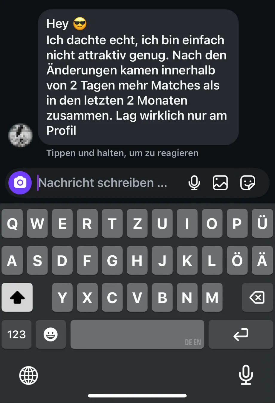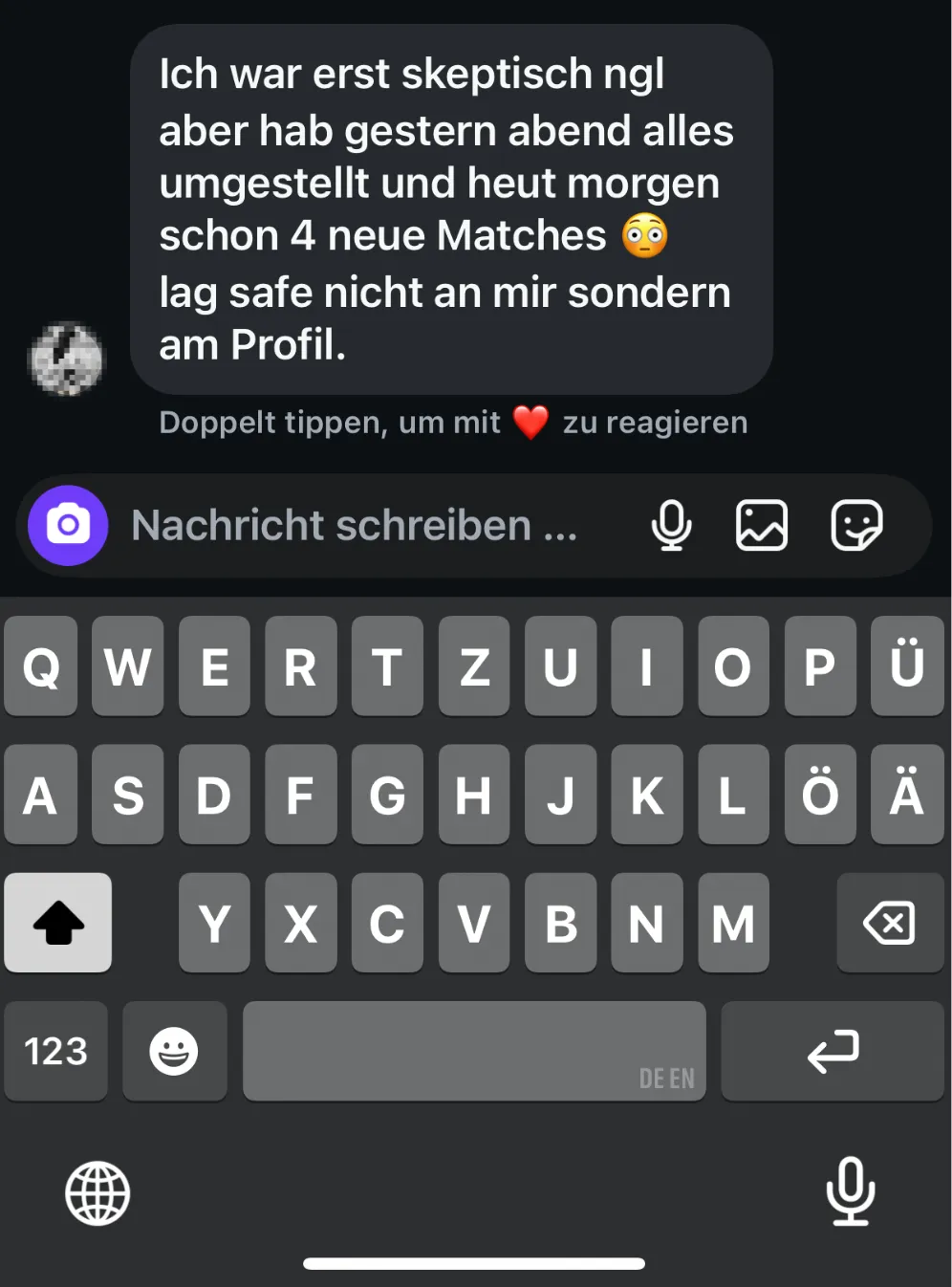 ➔ Ich habe Profilstrategien getestet, verworfen, perfektioniert – über Jahre, nicht aus irgendeinem Dating-Ratgeber, sondern durch tausende echte Matches und Dates.