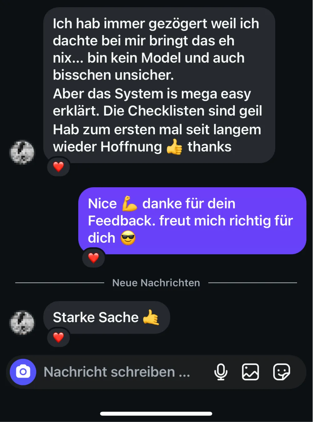 Das hier sind alles echte Klienten von mir, die ihre echte Meinung teilen. Niemand wurde in irgendeiner Form für sein Feedback bezahlt! Ich kann dir keine Ergebnisse garantieren. All diese Menschen auf dieser Seite haben hart für ihren Erfolg gearbeitet. Diese Erfolge sind i.d.R. nur möglich, wenn du vorher 1:1 mit mir innerhalb einer kostenlosen Beratungssession sprichst und unsere Strategie anwendest.