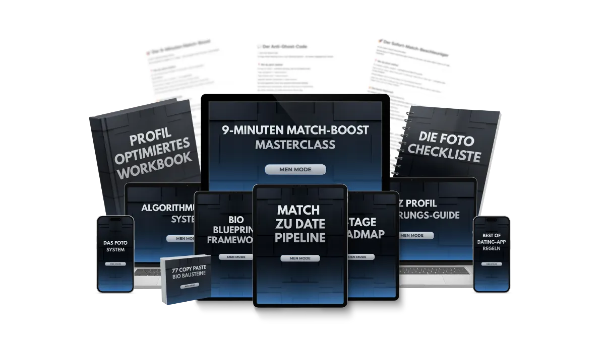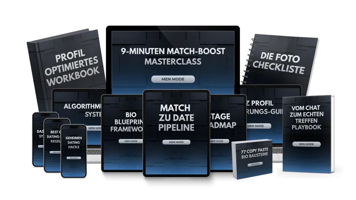 Du bekommst das komplette Match-Boost-System mit Profil-Vorlagen, Foto-Guide, Nachrichten-Templates, Video-Tutorials und Bonus-Material. Alles, was du brauchst, um sofort mehr Matches zu bekommen.